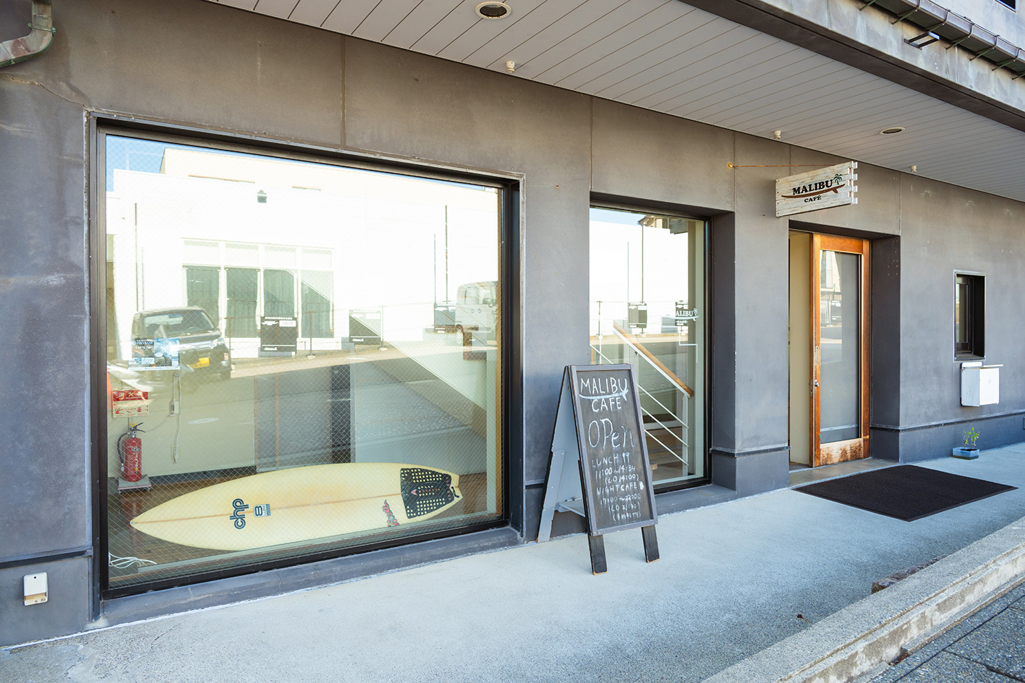 アメリカ西海岸の雰囲気が漂う、海をテーマにしたカフェ。波音のBGMが流れる心地いい空間で味わえるのは、オープン以来クチコミで広がった名物『ローストビーフ丼』(1,690円)だ。