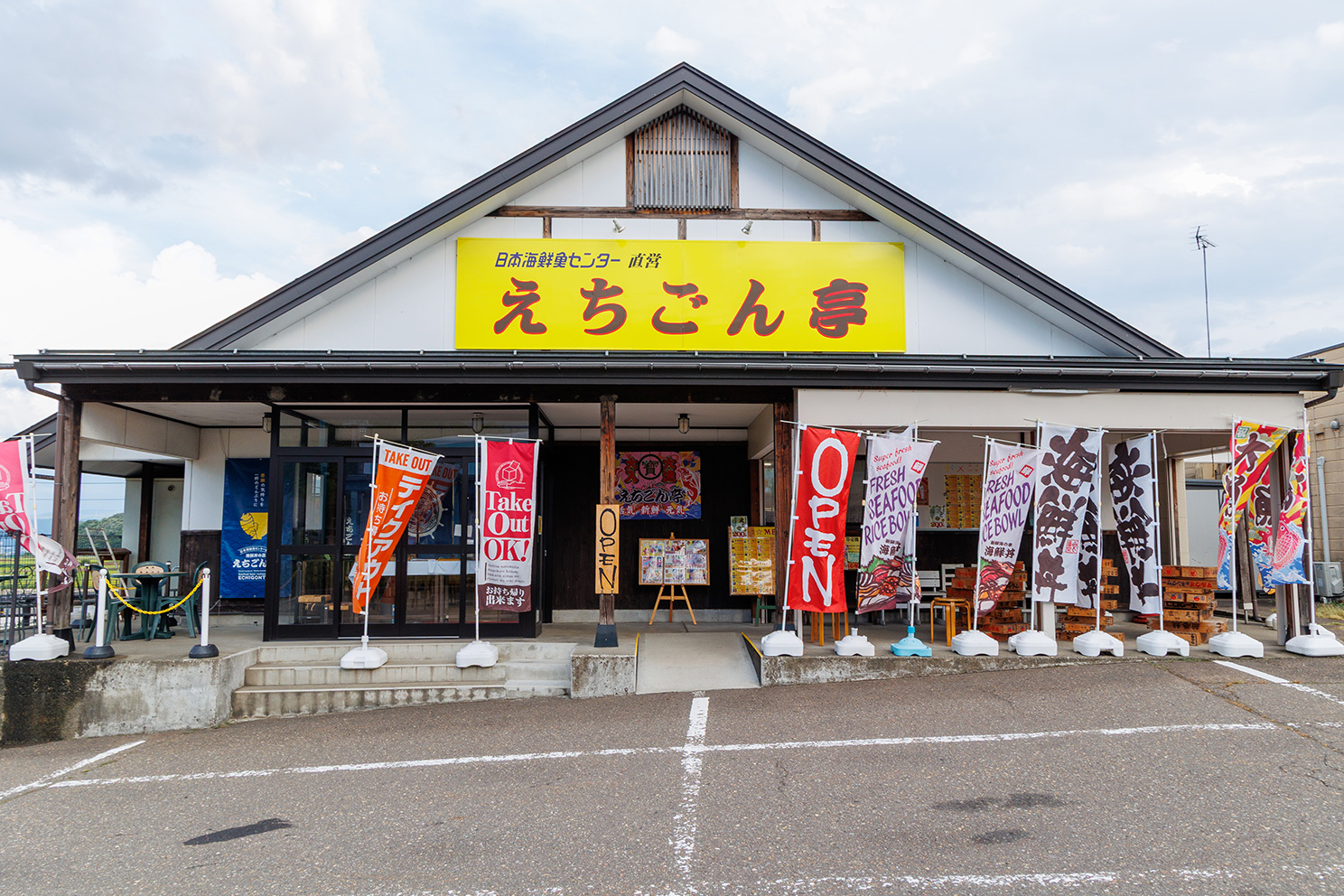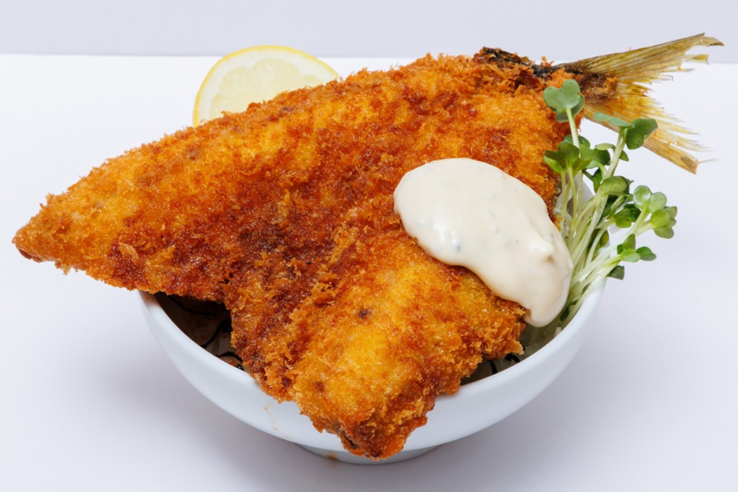 日本海鮮魚センター直営で、新鮮な海鮮を使った丼をメインに提供。『とにかくでっかいあじフライ丼』(1,280円)は、丼からはみ出るほどの大きなアジフライがご飯にドーンとのった数量限定メニュー。