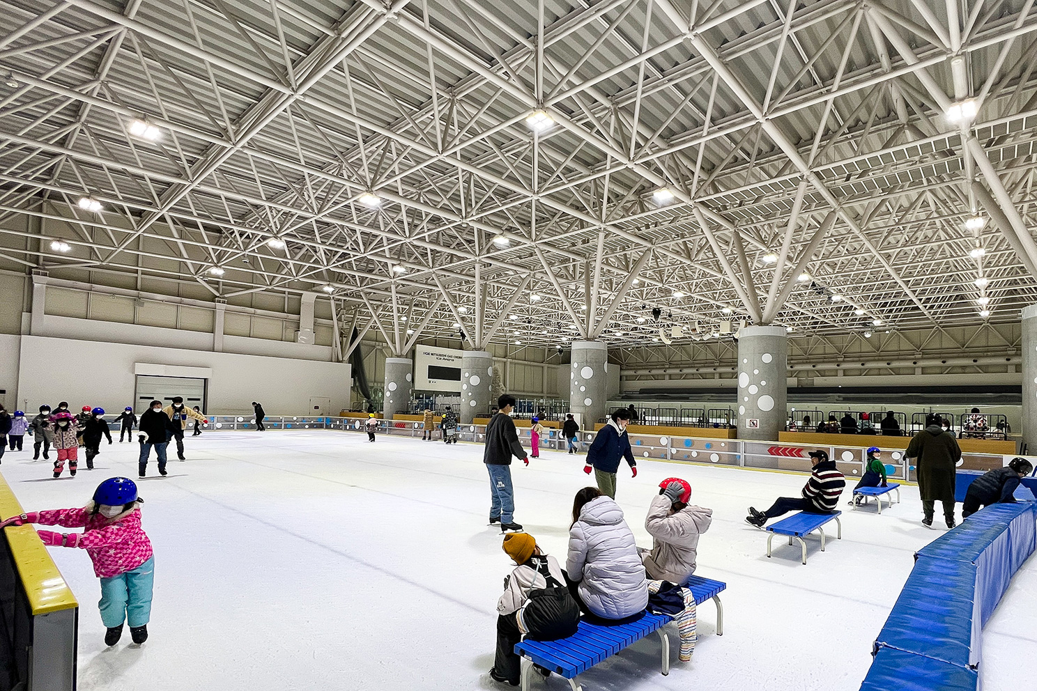 体育館やレジャープールを備え、市民活動やイベントの場としても親しまれる複合施設。 夏はジャンボプール、冬はアイスアリーナで遊ぶ親子を中心に賑わいを見せている。 1足200円でレンタルできるスケートシューズは、小さな子ども向けに安定感のある2枚刃のものを用意。 まずは氷の上でのバランス感覚を身に着けよう。 初心者にはスタッフが随時コツを教えてくれるうれしいサービスもある。 アイスアリーナは5月末までの営業を予定している。