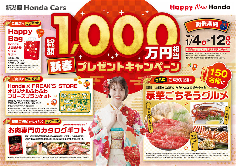 当サイトでもおなじみのホンダカーズ新潟中央をはじめとする県内のホンダカーズ各店では、2026年1月4日(日)~12(月祝)まで、総額1,000万円相当の新春プレゼントキャンペーンを実施中。